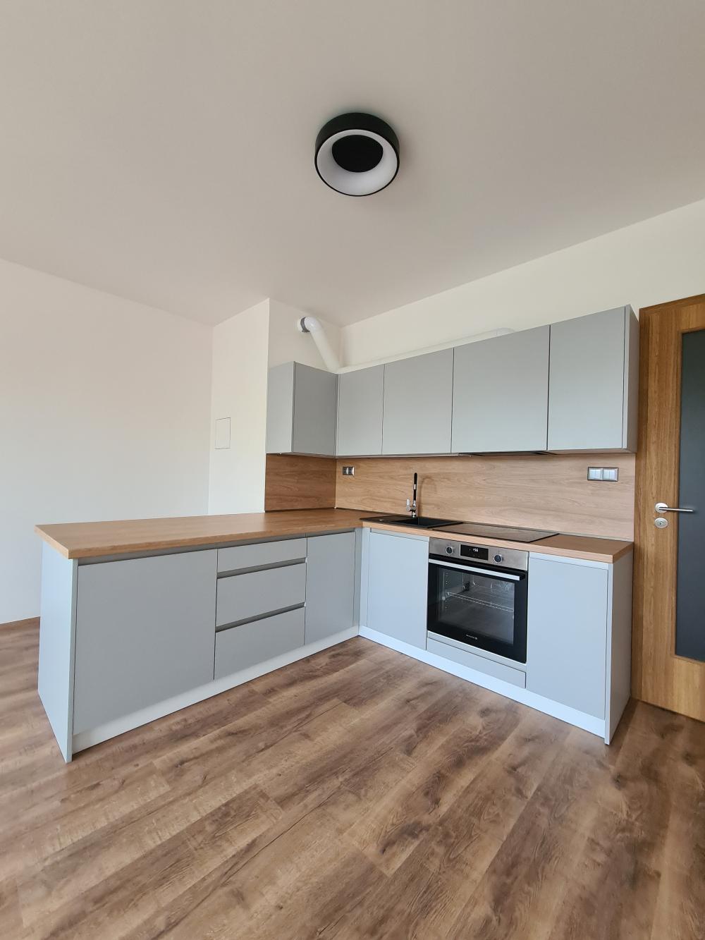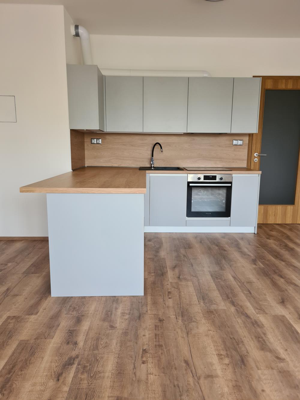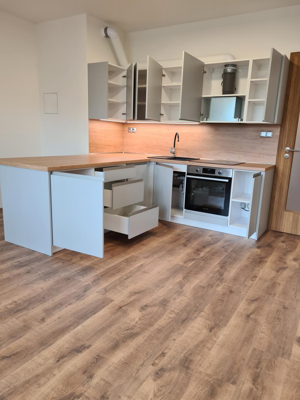 kuchyňskou linku s vestavěnými spotřebiči - myčka, trouba, varná deska, integrovaný odsavač, nerezový dřez a flexibilní baterie